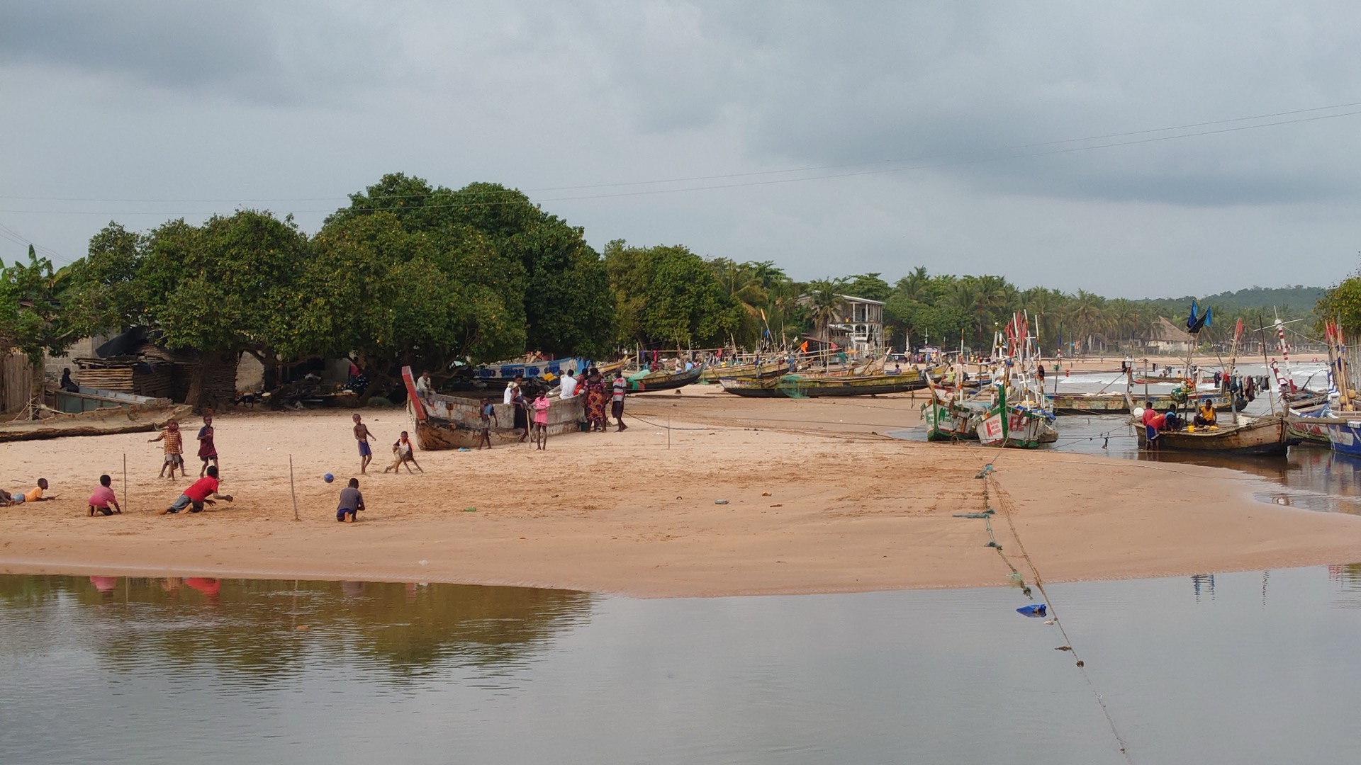 Ahanta Eco Lodge se nachází na jednom břehu říčky, my bydlíme v plážovém domku na druhém. Tak po lehkém občerstvení bereme batohy a v doprovodu místní slečny brodíme směrem k pláži. Na pláži míjíme místní rybáře, děti hrající fotbal a kozy.
