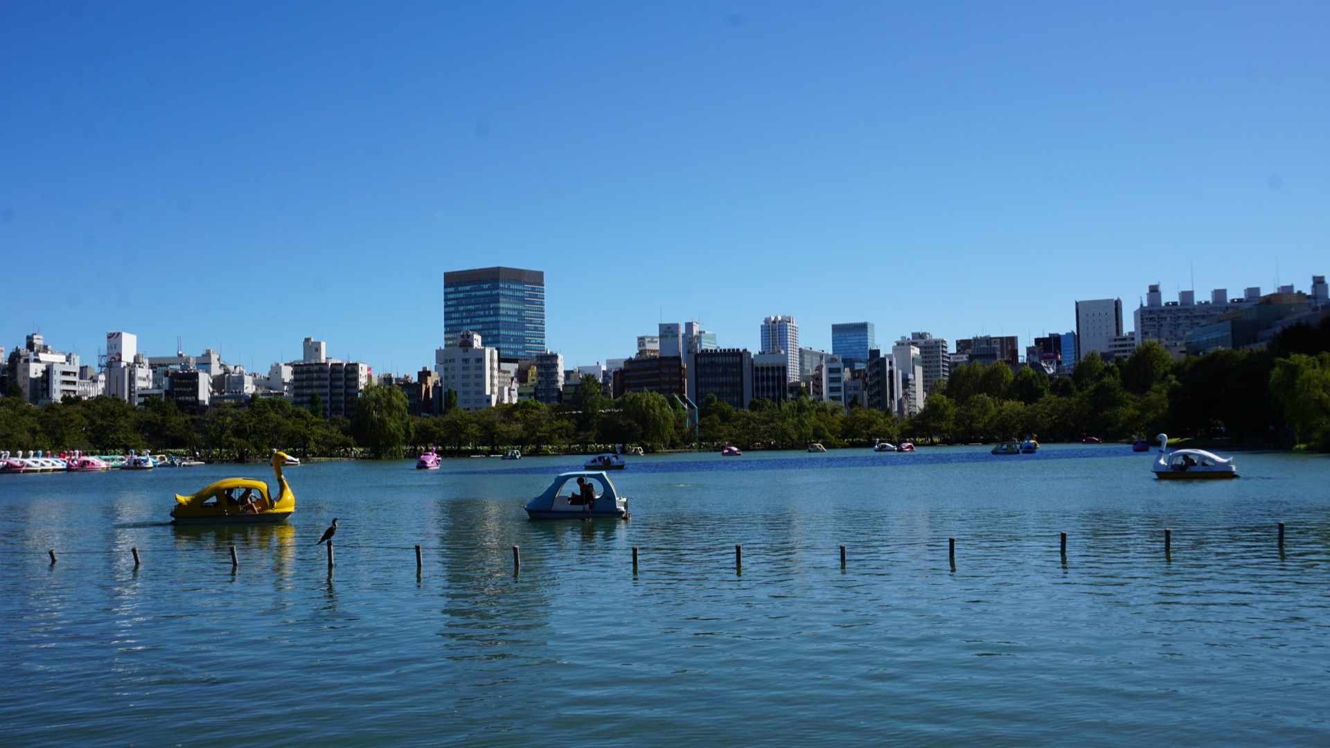Jenom kousek je vysekán a na něm se prohání šlapadla. Na rozdíl od pražských labutí jsou tyto zastřešené. Japonci opravdu nemají rádi slunce.