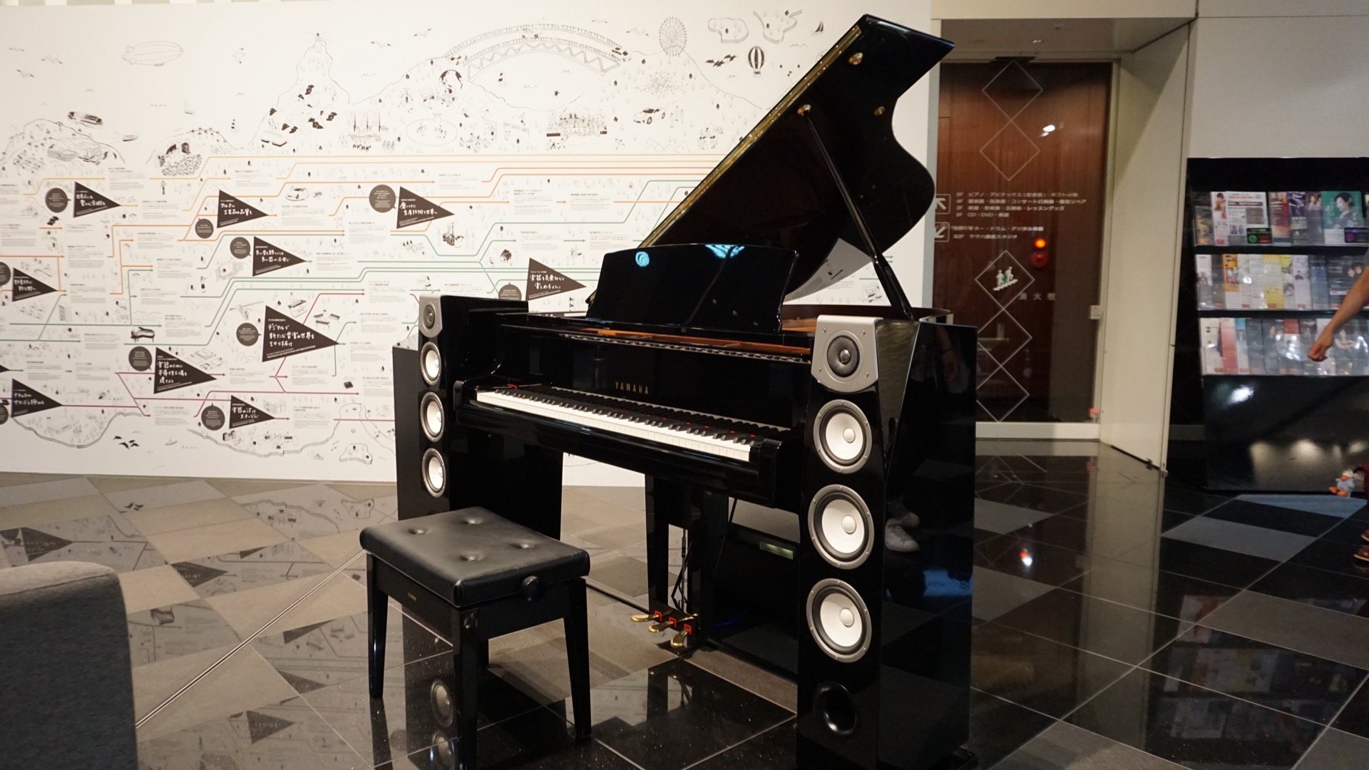 Mezi kabelkami je i showroom Yamahy s překrásným klavíro-sound systémem.