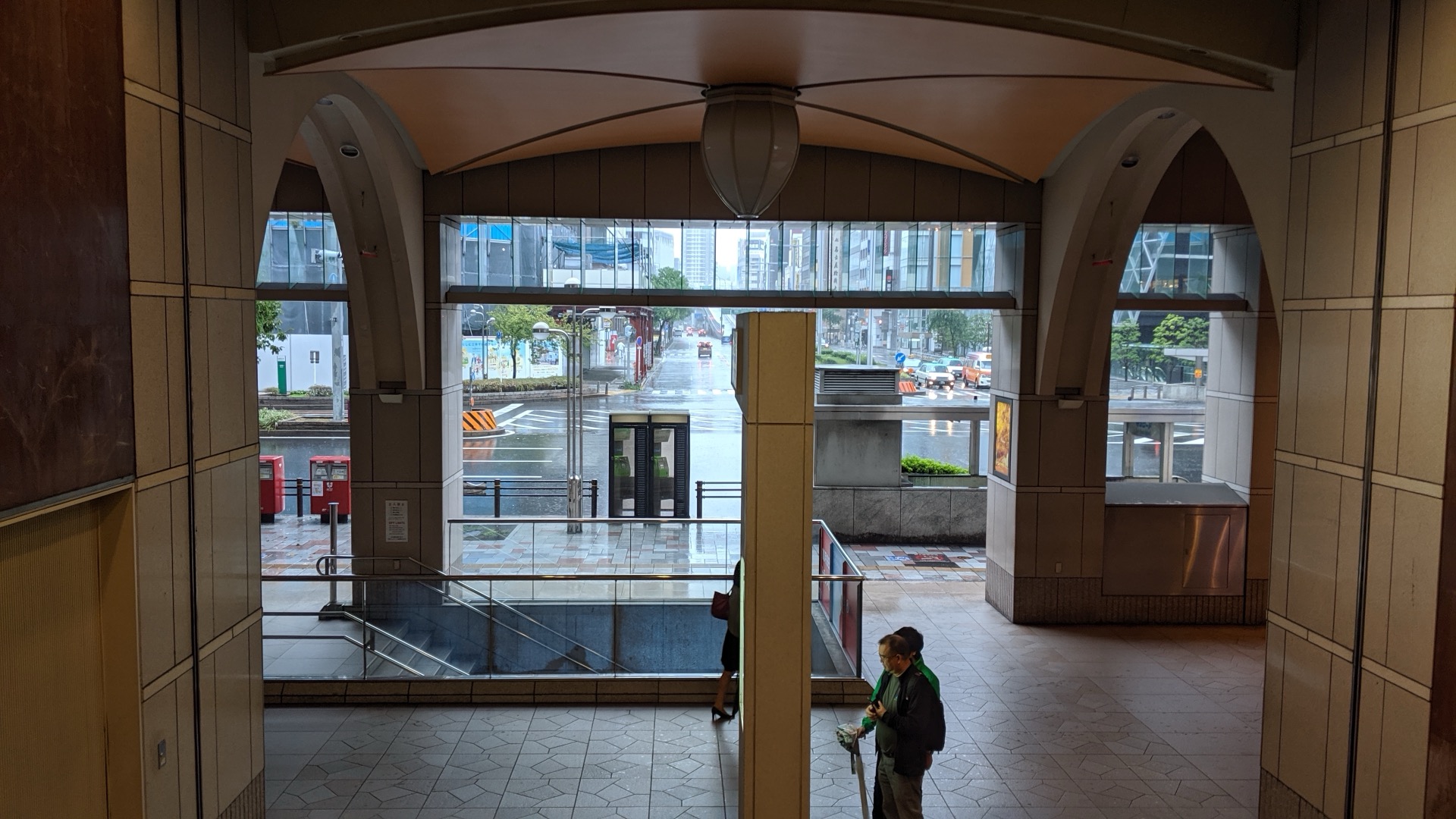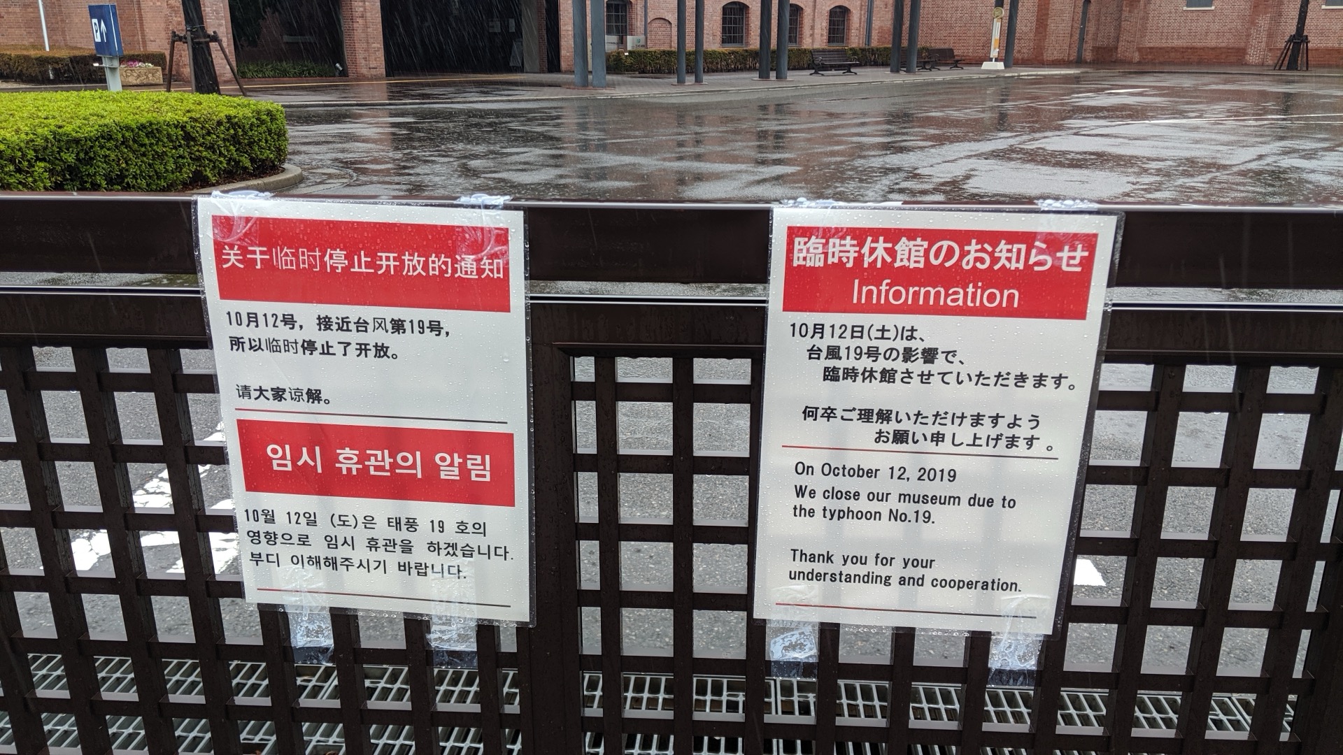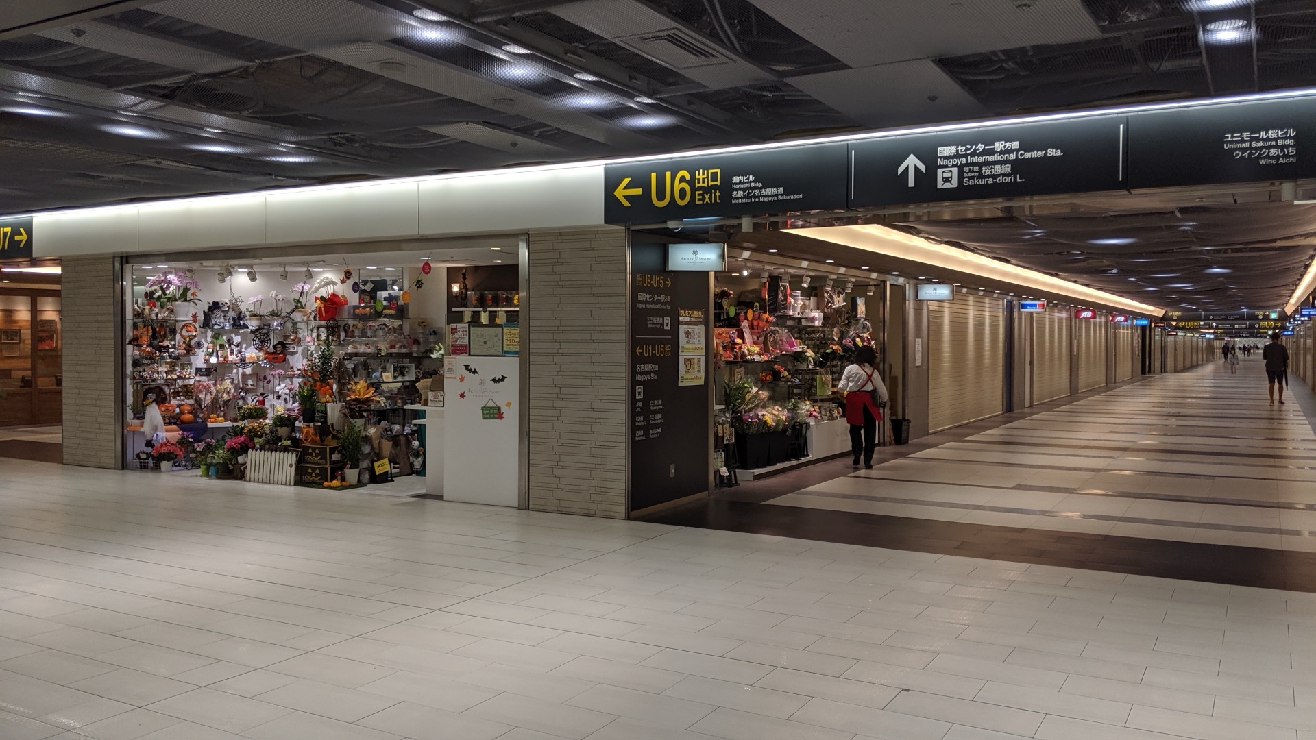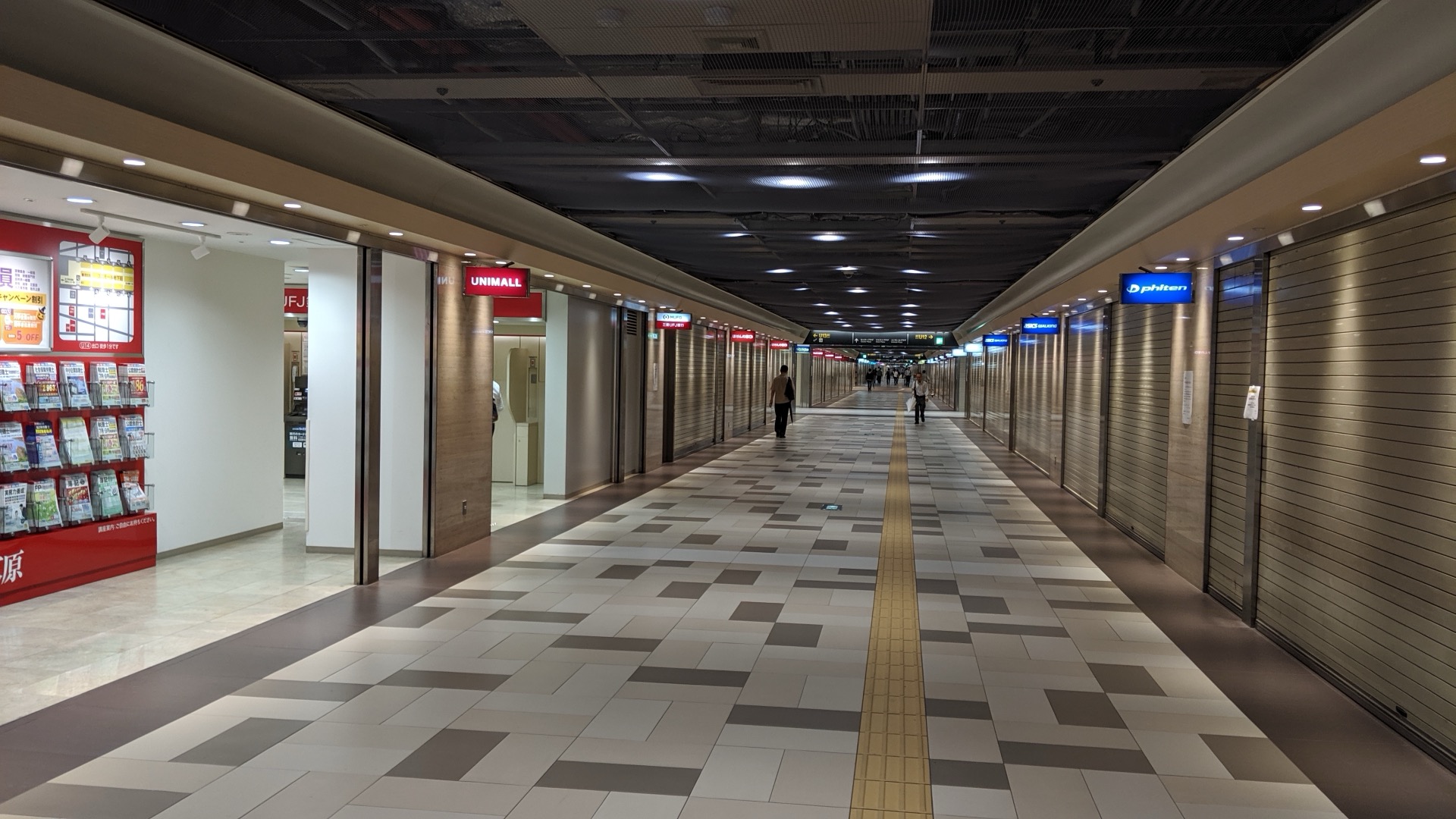 Vítr se občas ozve, ale nic zásadního se neděje. Přesto jsem rád za místní zálibu v budování podchodů. Z oněch dvou kilometrů se dá poměrně velká část urazit pod zemí. Tohle byla ještě včera obchodní pasáž, dneska už na většině obchodů visí jen oznámení, že dnes pro Tajfun zavřeno.