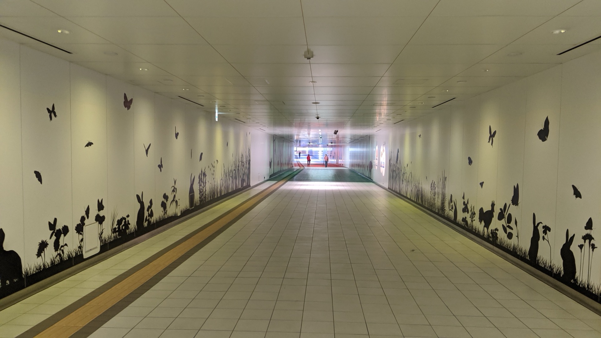 Další část tunelu má aspoň veselé obrázky na zdech.