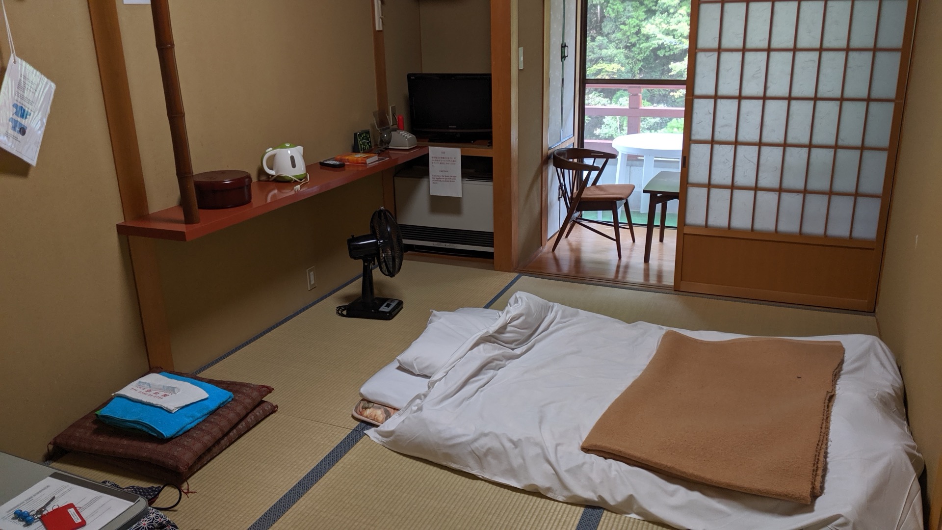 Je pravda, že na to jak se v Japonsku všude klaní a předhánějí v tom jak nejlíp posloužit a "služebníček pane", byl pan mnich řekněme rezervovaný. Pokojíček je ale úžasný, venku bublá vodopád na japonské zahradě a já bych se nejradši rovnou natáhl.