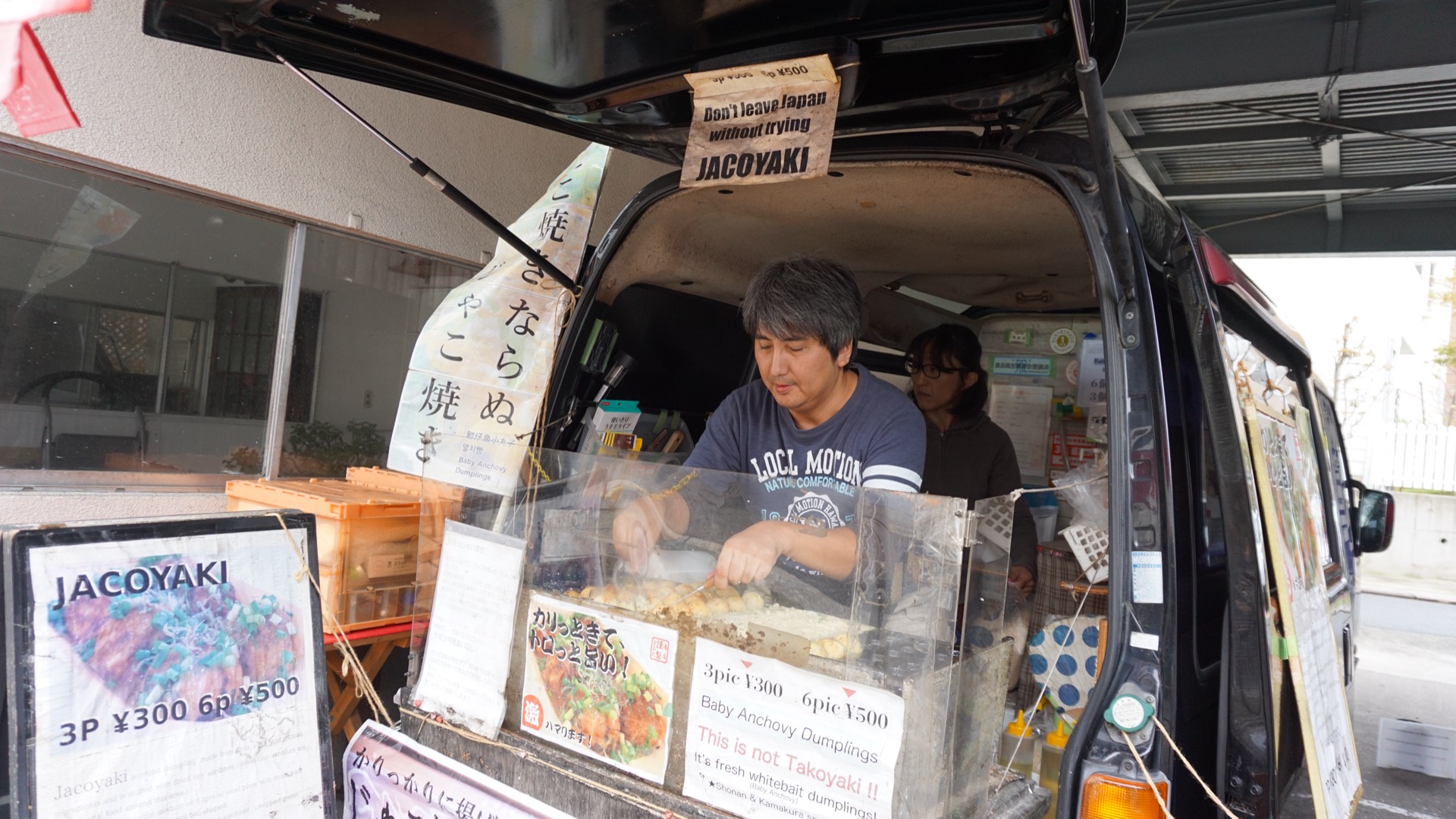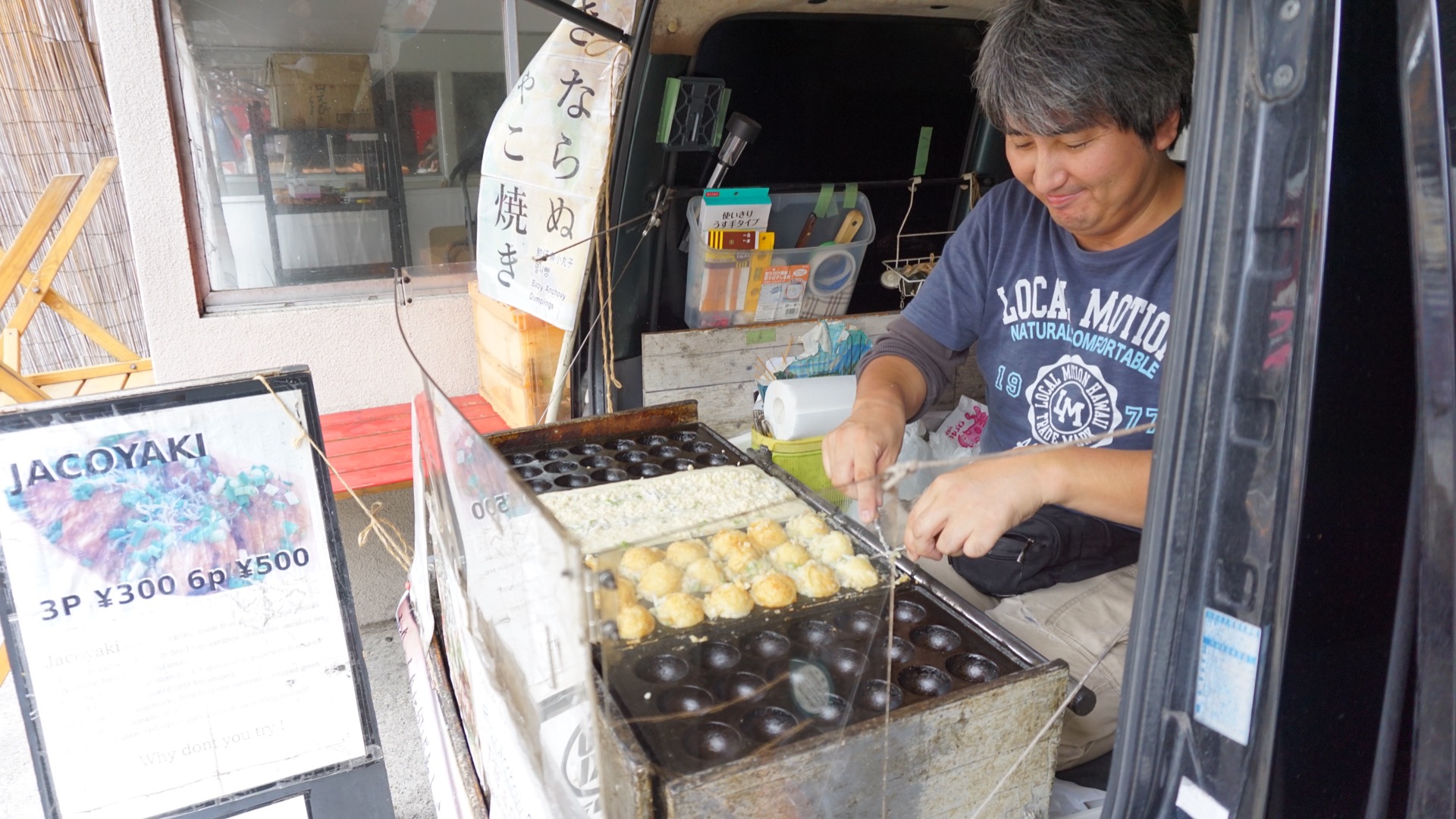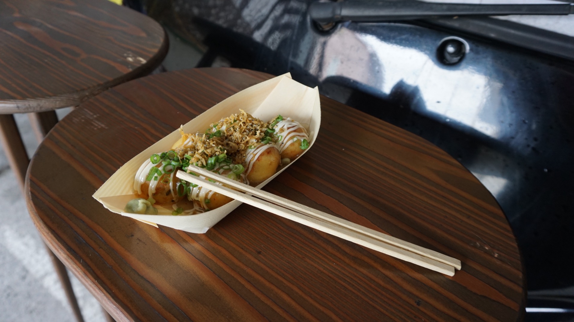 Ještě nad tím chvíli přemýšlím, ale už se začíná hlásit hlad. Naštěstí potkávám další úžasnou věc. Jacojaki, což, jak cedule upozorňuje, v žádném případě nejsou Takojaki. Vyzbrojen touto informací objednávám šest.