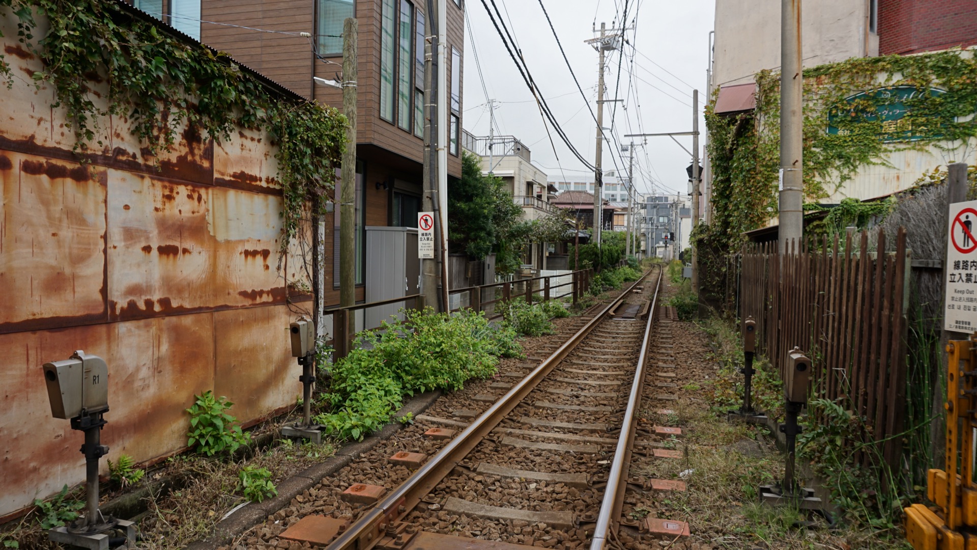 Cestou přes přejezd fotím koleje místní tramvaje, takhle se prodírá mezi domky téměř celou cestu z Enošimy.