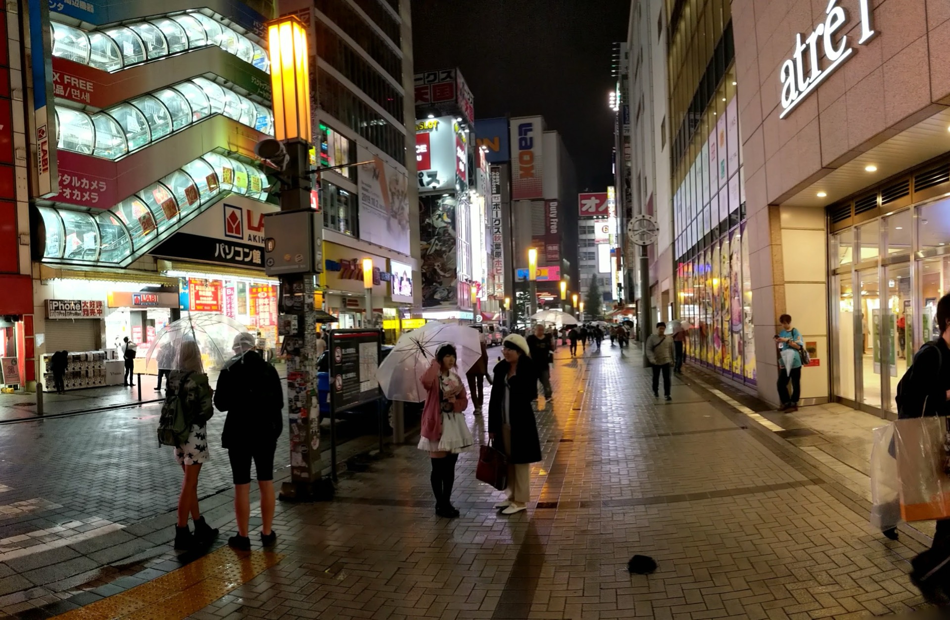 Večerní procházku mi zpříjemňují tihle muži v černém. V okolí mého hotelu je poměrně velké množství masážních salónů. Některé mají cedule venku, jiné jen nenápadné vchody. U těch vchodů právě postávají tihle pánové, dneska s deštníkem. Systém je zaměřen na lokální zákazníky, mě si ani nevšímají. Celé je to velmi japonsky decentní a odměřené. Když jsou ulice plné lidí, tak bych si jich ani nevšiml. Mají se svými zákazníky dost podobné oblečení, takže splynou v jednu černobílou masu. Dneska je ale dost pošmourno a navíc končí dlouhý víkend, tak jsou víc vidět.
