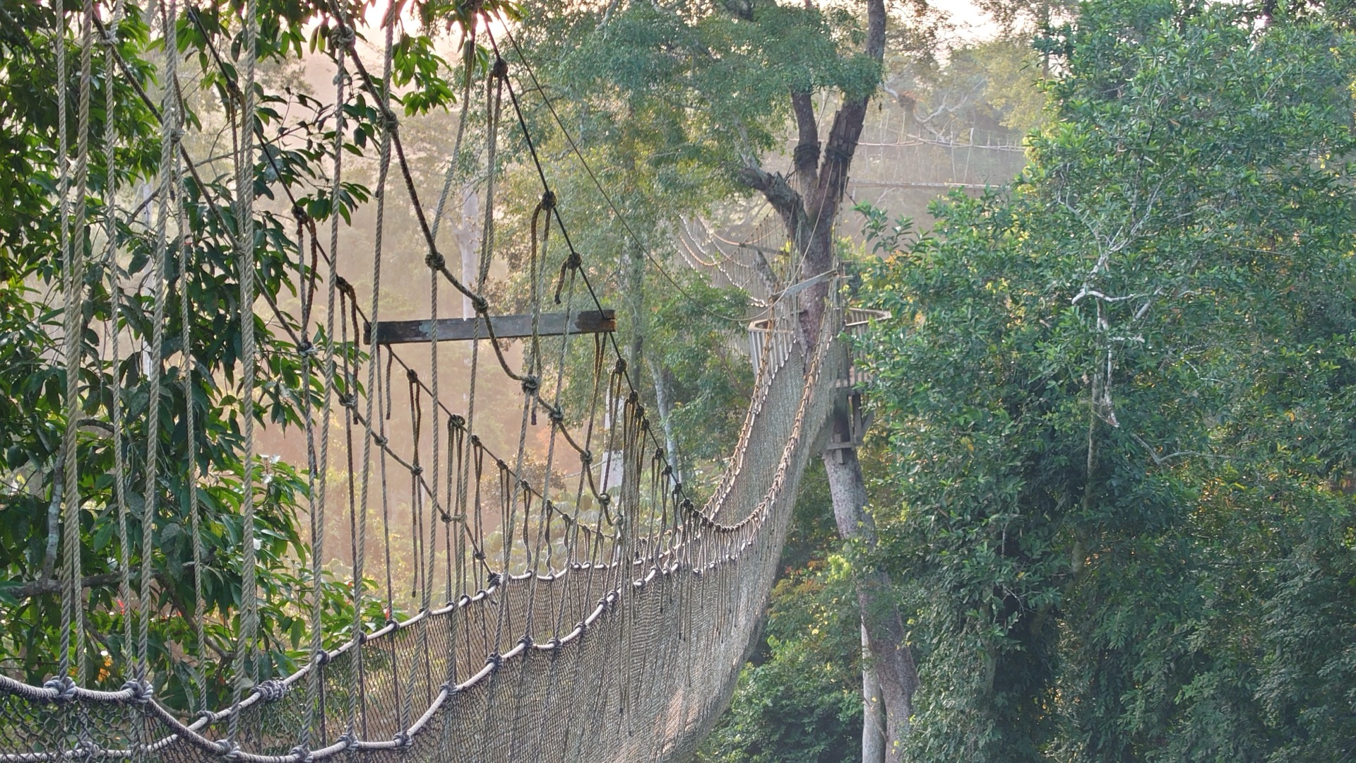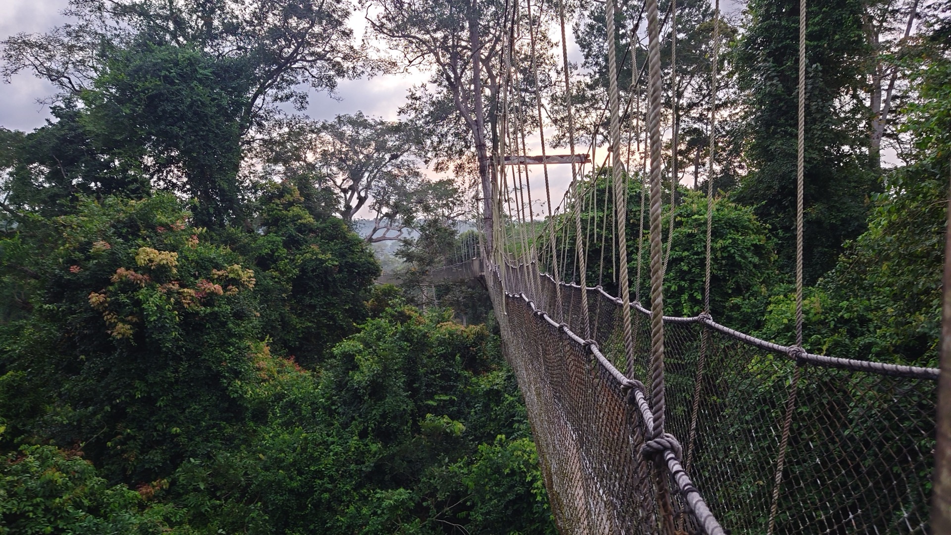 Po návratu jsem si ustlali na žíněnce. Noc samotná byl zážitek. Zvuky všude okolo, škrabání, tlapkání, občas řev opic. Nakonec jsme usnuli. Budíček byl ráno v pět, abychom byli s rozedněním na visutých lávkách.