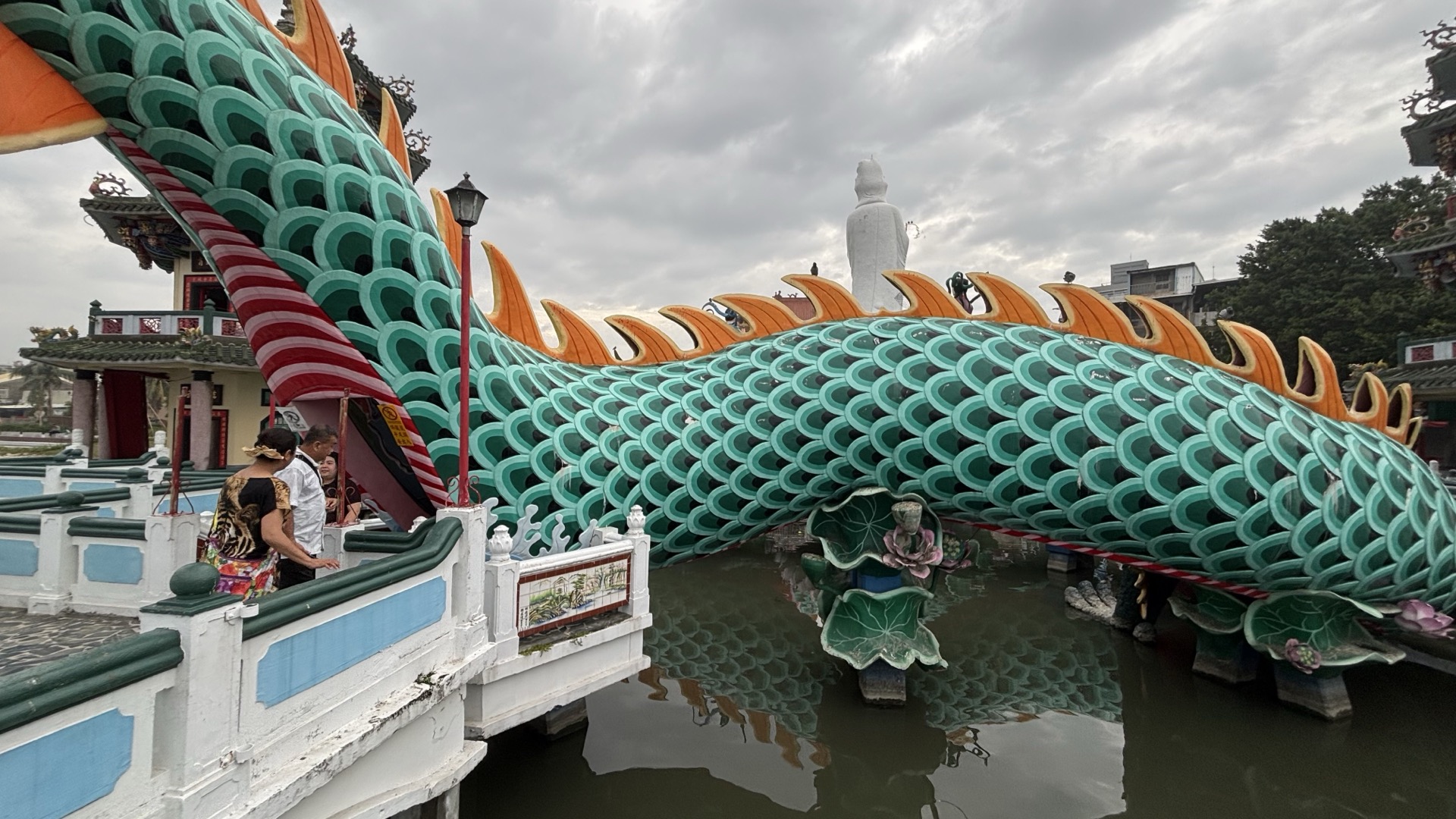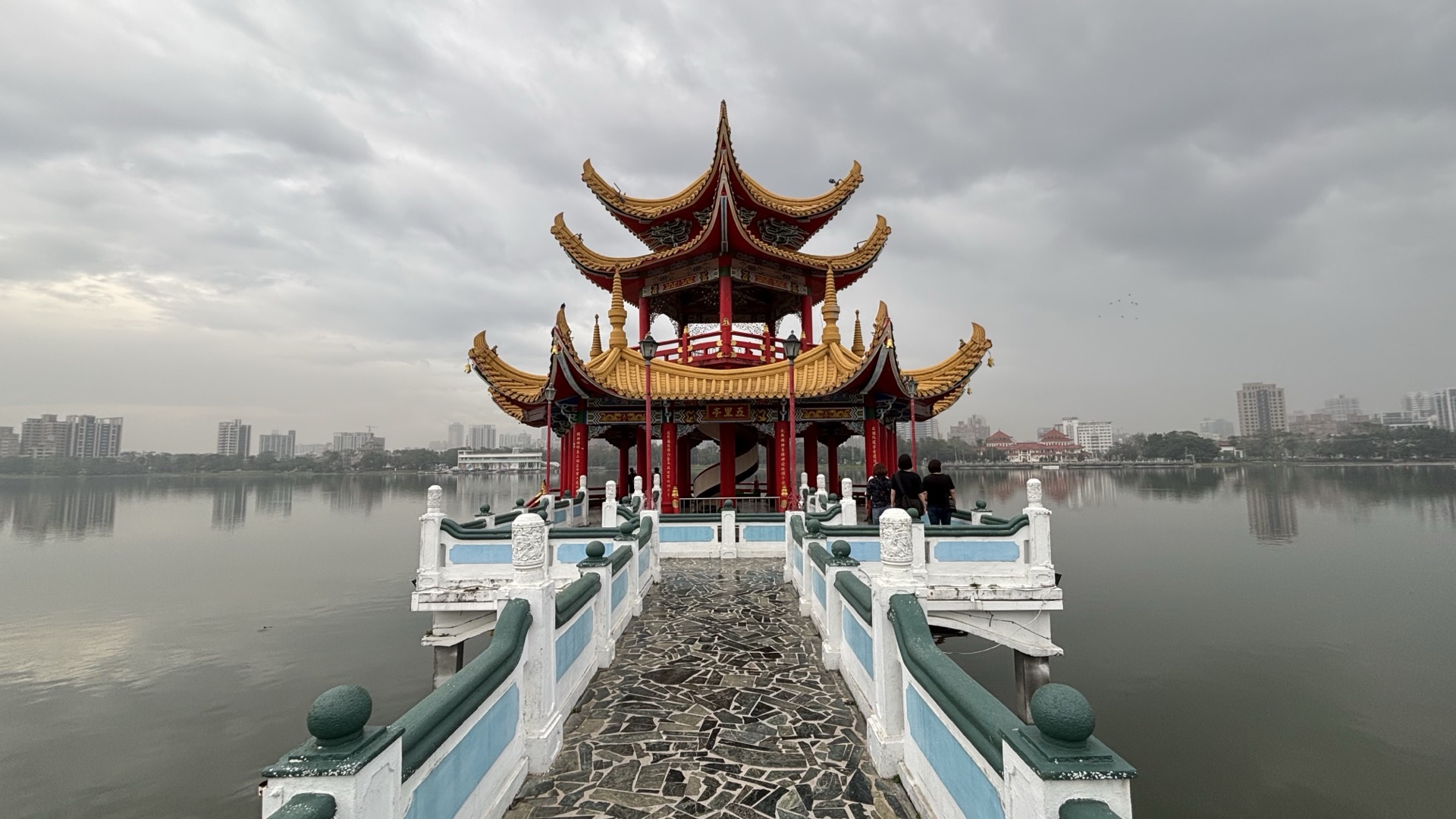 Po doplnění cukrů a kofeinů vyrážím dál mlhavým dnem. Další zajímavé místo je pavilon na jezeře. Cestou k němu, mezi dvěma pagodami, je možné projít drakem. Vejdete ústy,