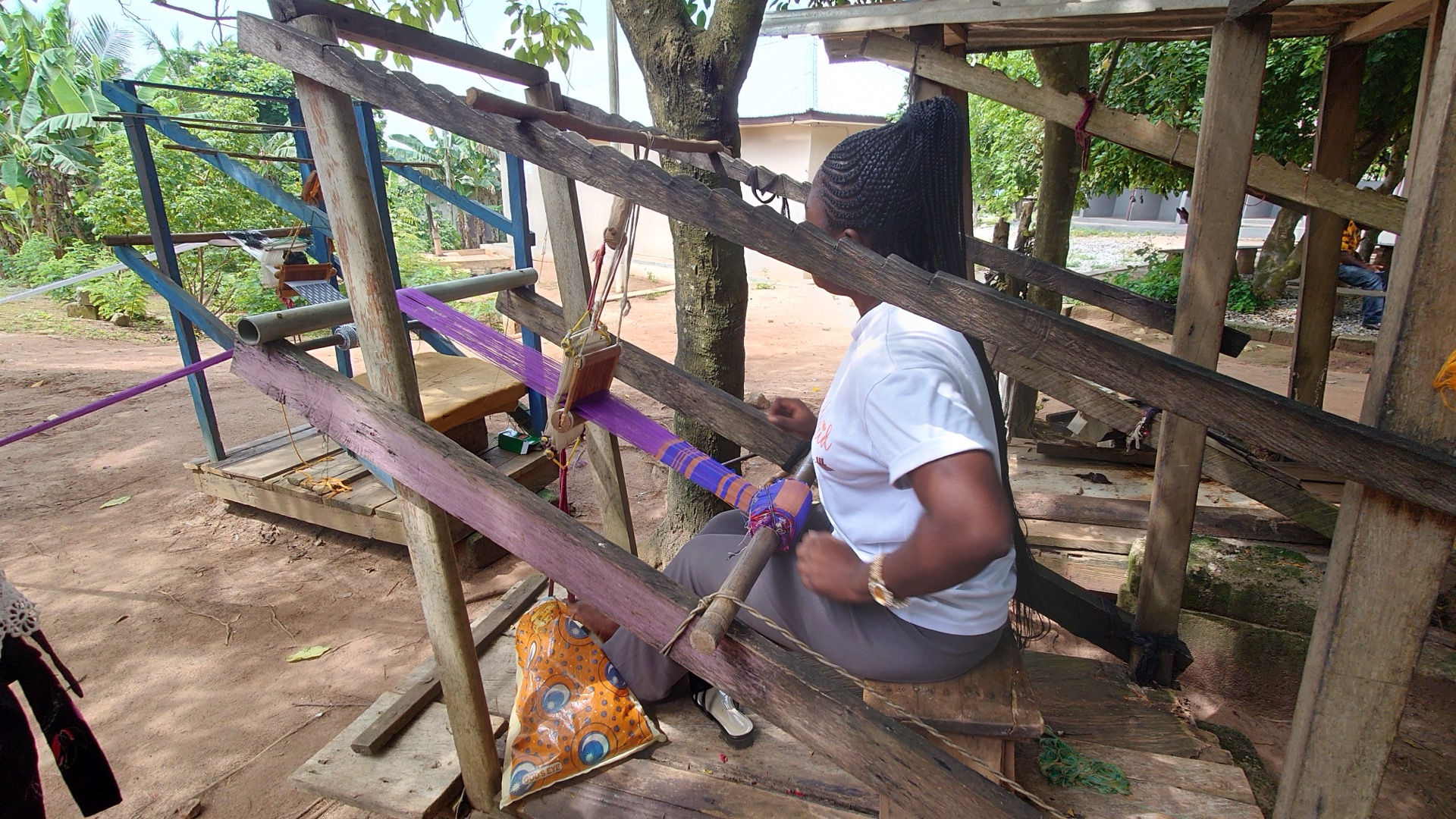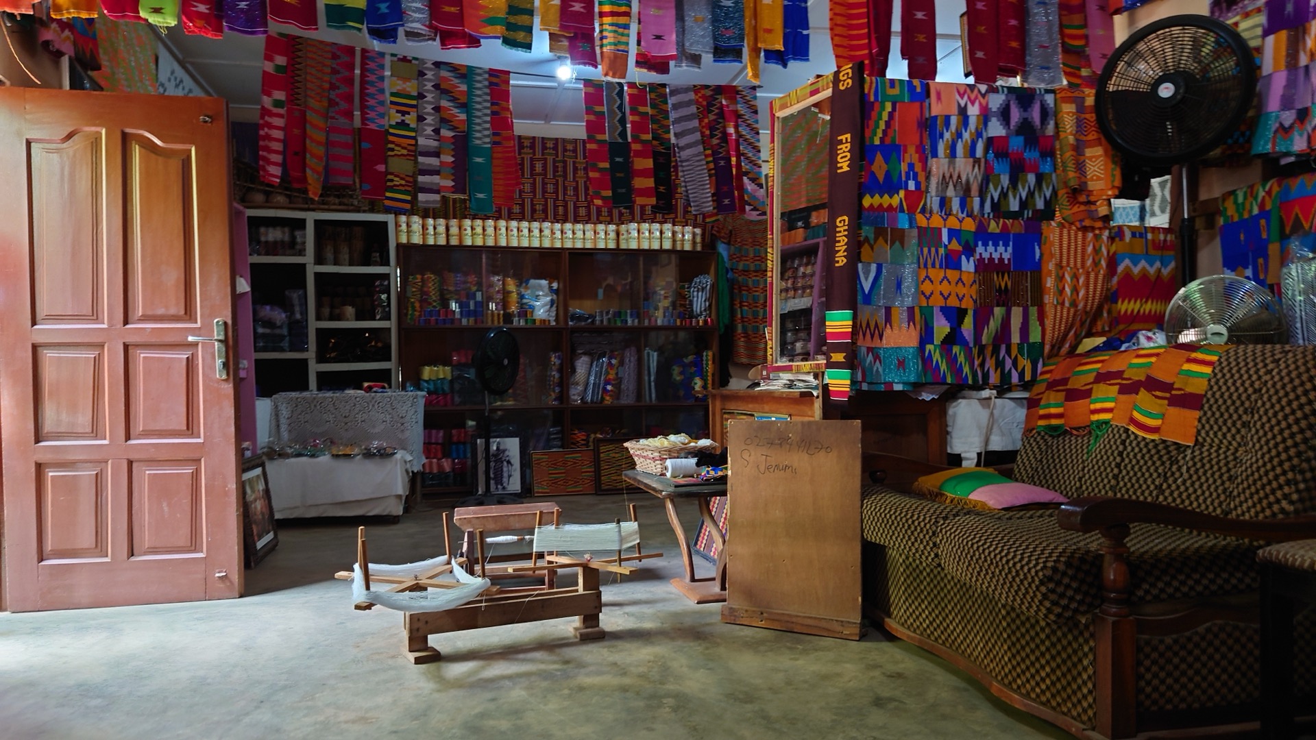 Ve vesničce Adanwomase nám řidič zastavuje u Kente Visitors Center. Kente jsou tradiční oděvy, které nás, upřímně, zajímaly o dost míň, než kakaovníky, ale tady je všechno dohromady.