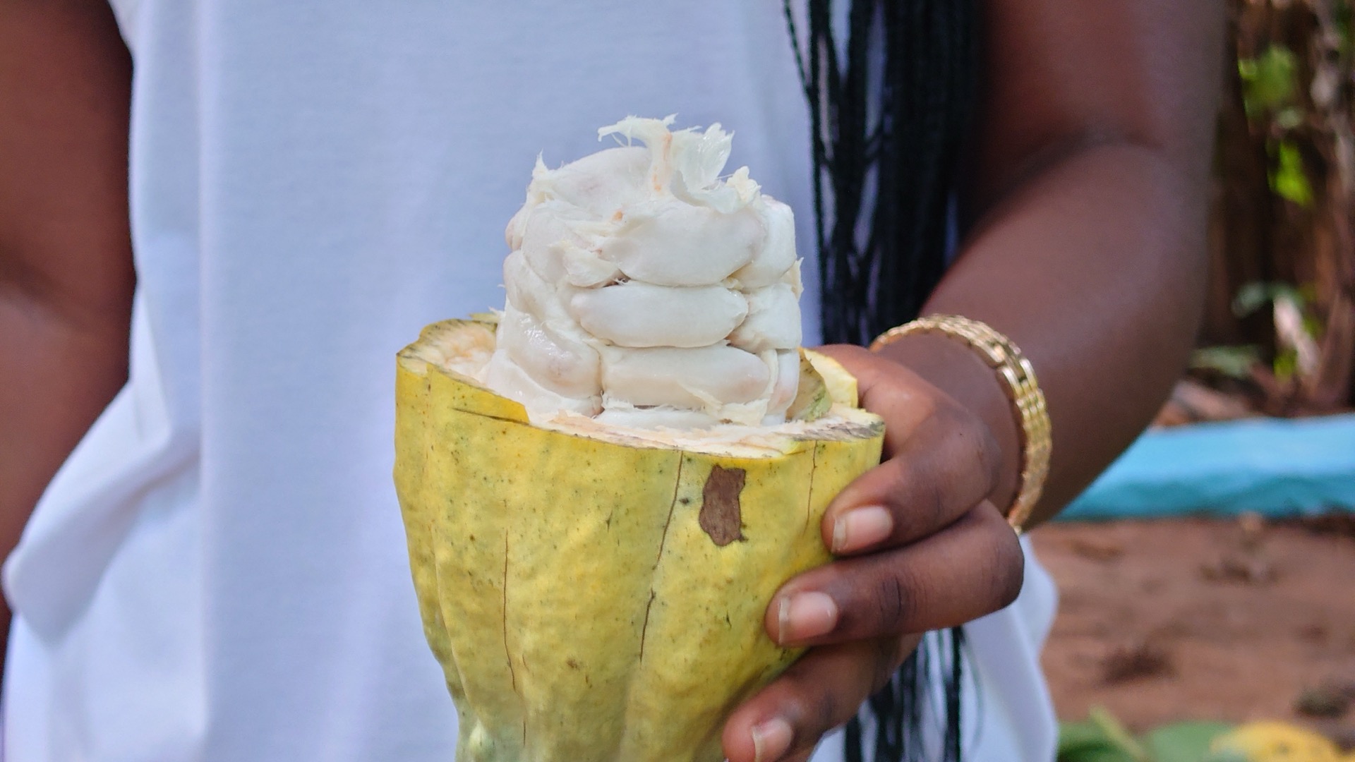 Dostaneme ochutnat pár kakaových bobů a jeden čerstvě utržený lusk od cesty. Sedáme zpátky do auta a míříme do Kumasi. Cestou máme ještě v ceně oběd. Ale protože jsme smlouvali cenu a chtěli něco autentičtějšího, zavede nás průvodce místo luxusní restaurace k stánku, kde prý s řidičem často sami jedí.